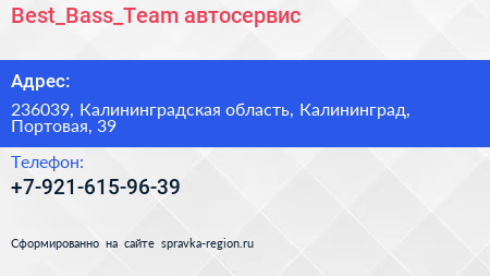 Best_Bass_Team, автосервис по адресу 236039, Калининградская область, Калининград, Портовая, 39 в дальнейшем Организация, размещена в следующих категориях: