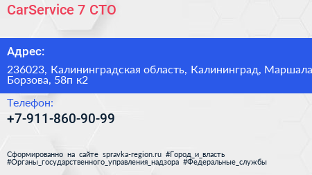 CarService №7, СТО по адресу 236023, Калининградская область, Калининград, Маршала Борзова, 58п к2 в дальнейшем Организация, размещена в следующих категориях: