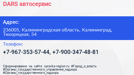 DARS, автосервис по адресу 236005, Калининградская область, Калининград, Тихорецкая, 54 в дальнейшем Организация, размещена в следующих категориях: