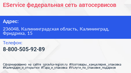 EService, федеральная сеть автосервисов по адресу 236048, Калининградская область, Калининград, Фридриха, 15 в дальнейшем Организация, размещена в следующих категориях: