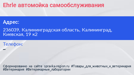 Ehrle, автомойка самообслуживания по адресу 236039, Калининградская область, Калининград, Киевская, 19 к2 в дальнейшем Организация, размещена в следующих категориях: