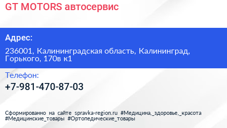 GT MOTORS, автосервис по адресу 236001, Калининградская область, Калининград, Горького, 170в к1 в дальнейшем Организация, размещена в следующих категориях: