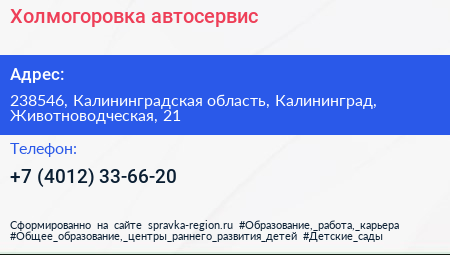 Холмогоровка, автосервис по адресу 238546, Калининградская область, Калининград, Животноводческая, 21 в дальнейшем Организация, размещена в следующих категориях: