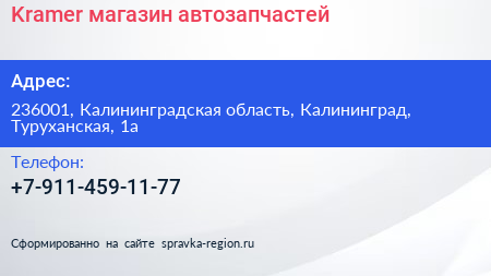 Kramer, магазин автозапчастей по адресу 236001, Калининградская область, Калининград, Туруханская, 1а в дальнейшем Организация, размещена в следующих категориях: