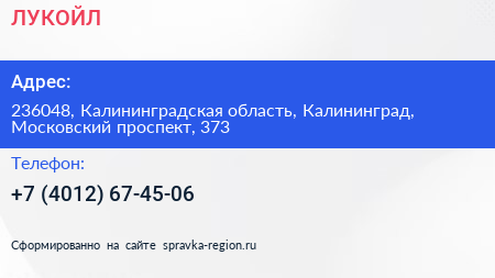 ЛУКОЙЛ по адресу 236048, Калининградская область, Калининград, Московский проспект, 373 в дальнейшем Организация, размещена в следующих категориях: