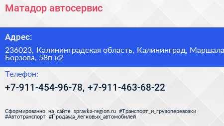 Матадор, автосервис по адресу 236023, Калининградская область, Калининград, Маршала Борзова, 58п к2 в дальнейшем Организация, размещена в следующих категориях: