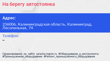 На берегу, автостоянка по адресу 236006, Калининградская область, Калининград, Лесопильная, 74 в дальнейшем Организация, размещена в следующих категориях: