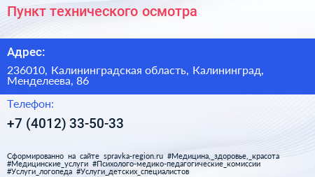 Пункт технического осмотра по адресу 236010, Калининградская область, Калининград, Менделеева, 86 в дальнейшем Организация, размещена в следующих категориях: