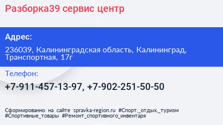 Разборка39, сервис-центр по адресу 236039, Калининградская область, Калининград, Транспортная, 17г в дальнейшем Организация, размещена в следующих категориях: