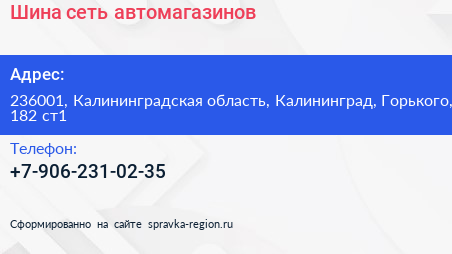 Шина, сеть автомагазинов по адресу 236001, Калининградская область, Калининград, Горького, 182 ст1 в дальнейшем Организация, размещена в следующих категориях: