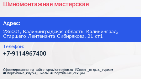 Шиномонтажная мастерская по адресу 236001, Калининградская область, Калининград, Старшего Лейтенанта Сибирякова, 21 ст1 в дальнейшем Организация, размещена в следующих категориях: