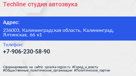 Techline, студия автозвука по адресу 236003, Калининградская область, Калининград, Ялтинская, 66 к1 в дальнейшем Организация, размещена в следующих категориях: