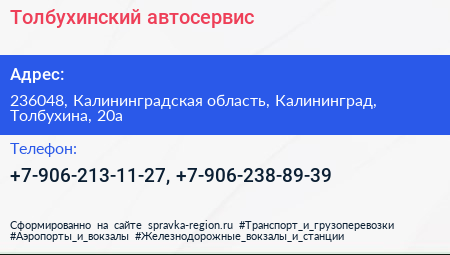 Толбухинский, автосервис по адресу 236048, Калининградская область, Калининград, Толбухина, 20а в дальнейшем Организация, размещена в следующих категориях: