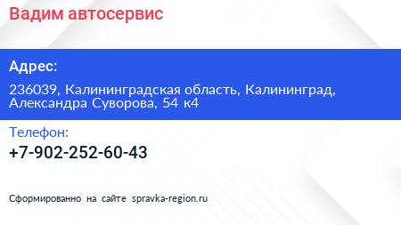 Вадим, автосервис по адресу 236039, Калининградская область, Калининград, Александра Суворова, 54 к4 в дальнейшем Организация, размещена в следующих категориях:
