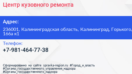 Центр кузовного ремонта по адресу 236001, Калининградская область, Калининград, Горького, 166а к1 в дальнейшем Организация, размещена в следующих категориях: