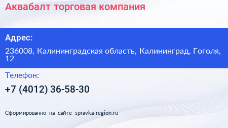 Аквабалт, торговая компания по адресу 236008, Калининградская область, Калининград, Гоголя, 12 в дальнейшем Организация, размещена в следующих категориях: