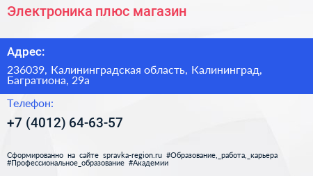 Электроника плюс, магазин по адресу 236039, Калининградская область, Калининград, Багратиона, 29а в дальнейшем Организация, размещена в следующих категориях: