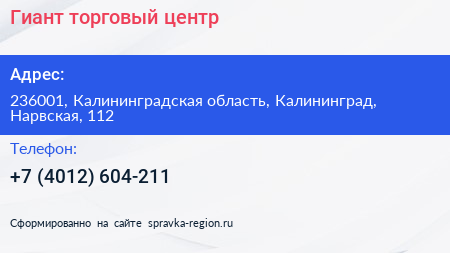 Гиант, торговый центр по адресу 236001, Калининградская область, Калининград, Нарвская, 112 в дальнейшем Организация, размещена в следующих категориях: