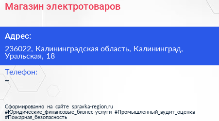 Магазин электротоваров по адресу 236022, Калининградская область, Калининград, Уральская, 18 в дальнейшем Организация, размещена в следующих категориях: