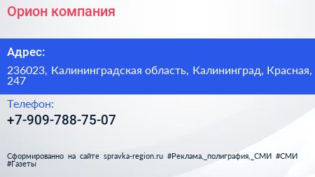Орион, компания по адресу 236023, Калининградская область, Калининград, Красная, 247 в дальнейшем Организация, размещена в следующих категориях:
