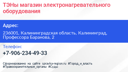 ТЭНы, магазин электронагревательного оборудования по адресу 236001, Калининградская область, Калининград, Профессора Баранова, 2 в дальнейшем Организация, размещена в следующих категориях: