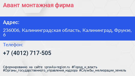 Авант, монтажная фирма по адресу 236006, Калининградская область, Калининград, Фрунзе, 6 в дальнейшем Организация, размещена в следующих категориях: