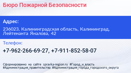 Бюро Пожарной Безопасности по адресу 236023, Калининградская область, Калининград, Лейтенанта Яналова, 42 в дальнейшем Организация, размещена в следующих категориях: