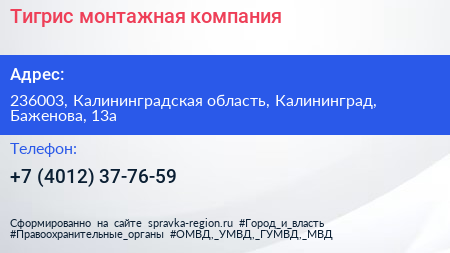 Тигрис, монтажная компания по адресу 236003, Калининградская область, Калининград, Баженова, 13а в дальнейшем Организация, размещена в следующих категориях: