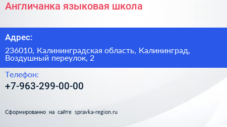 Англичанка, языковая школа по адресу 236010, Калининградская область, Калининград, Воздушный переулок, 2 в дальнейшем Организация, размещена в следующих категориях: