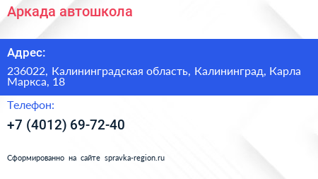 Аркада, автошкола по адресу 236022, Калининградская область, Калининград, Карла Маркса, 18 в дальнейшем Организация, размещена в следующих категориях: