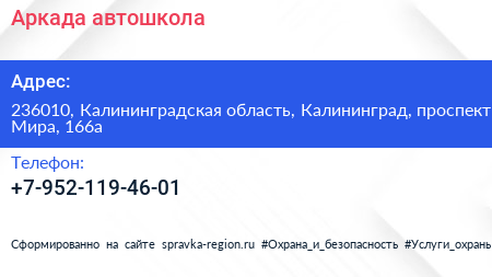 Аркада, автошкола по адресу 236010, Калининградская область, Калининград, проспект Мира, 166а в дальнейшем Организация, размещена в следующих категориях: