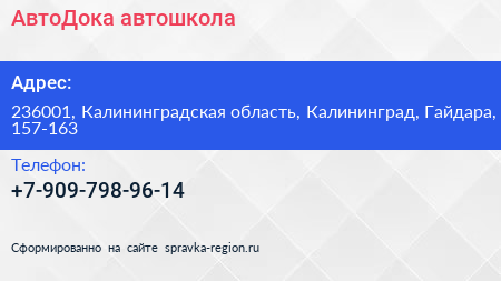 АвтоДока, автошкола по адресу 236001, Калининградская область, Калининград, Гайдара, 157-163 в дальнейшем Организация, размещена в следующих категориях: