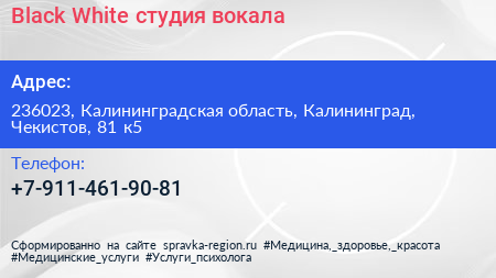Black & White, студия вокала по адресу 236023, Калининградская область, Калининград, Чекистов, 81 к5 в дальнейшем Организация, размещена в следующих категориях: