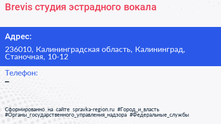 Brevis, студия эстрадного вокала по адресу 236010, Калининградская область, Калининград, Станочная, 10-12 в дальнейшем Организация, размещена в следующих категориях: