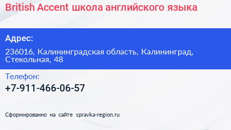 British Accent, школа английского языка по адресу 236016, Калининградская область, Калининград, Стекольная, 48 в дальнейшем Организация, размещена в следующих категориях: