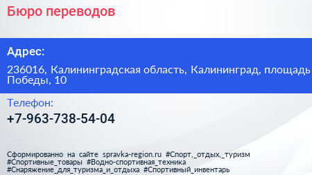 Бюро переводов по адресу 236016, Калининградская область, Калининград, площадь Победы, 10 в дальнейшем Организация, размещена в следующих категориях: