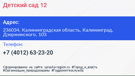 Детский сад №12 по адресу 236034, Калининградская область, Калининград, Дзержинского, 103 в дальнейшем Организация, размещена в следующих категориях: