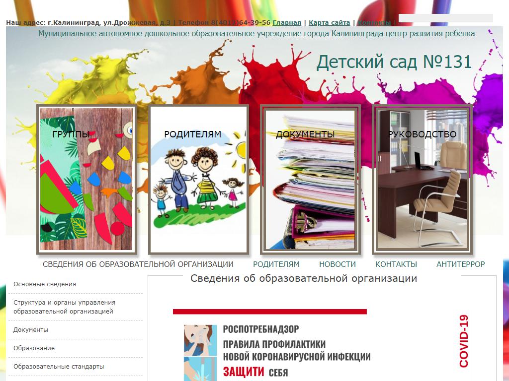 Детский сад №131 по адресу 236011, Калининградская область, Калининград, Дрожжевая, 3 в дальнейшем Организация, размещена в следующих категориях: