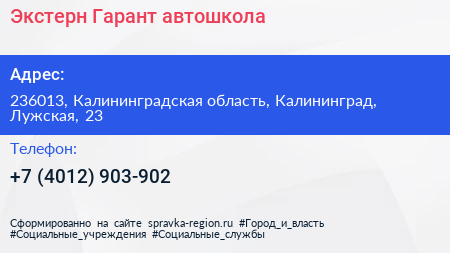 Экстерн-Гарант, автошкола по адресу 236013, Калининградская область, Калининград, Лужская, 23 в дальнейшем Организация, размещена в следующих категориях: