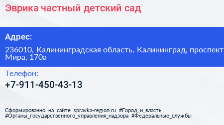 Эврика, частный детский сад по адресу 236010, Калининградская область, Калининград, проспект Мира, 170а в дальнейшем Организация, размещена в следующих категориях: