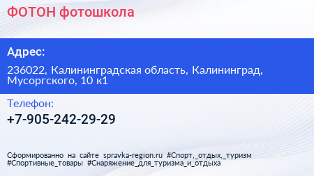 ФОТОН, фотошкола по адресу 236022, Калининградская область, Калининград, Мусоргского, 10 к1 в дальнейшем Организация, размещена в следующих категориях: