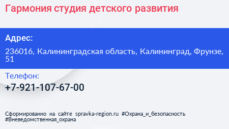 Гармония, студия детского развития по адресу 236016, Калининградская область, Калининград, Фрунзе, 51 в дальнейшем Организация, размещена в следующих категориях: