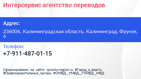 Интерсервис, агентство переводов по адресу 236006, Калининградская область, Калининград, Фрунзе, 6 в дальнейшем Организация, размещена в следующих категориях: