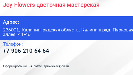 Joy Flowers, цветочная мастерская по адресу 236001, Калининградская область, Калининград, Парковая аллея, 44-46 в дальнейшем Организация, размещена в следующих категориях: