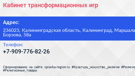Кабинет трансформационных игр по адресу 236023, Калининградская область, Калининград, Маршала Борзова, 58а в дальнейшем Организация, размещена в следующих категориях: