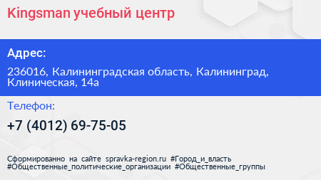 Kingsman, учебный центр по адресу 236016, Калининградская область, Калининград, Клиническая, 14а в дальнейшем Организация, размещена в следующих категориях: