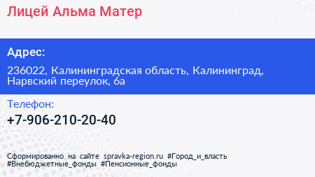 Лицей Альма Матер по адресу 236022, Калининградская область, Калининград, Нарвский переулок, 6а в дальнейшем Организация, размещена в следующих категориях: