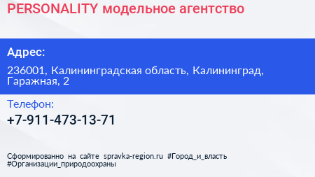 PERSONALITY, модельное агентство по адресу 236001, Калининградская область, Калининград, Гаражная, 2 в дальнейшем Организация, размещена в следующих категориях: