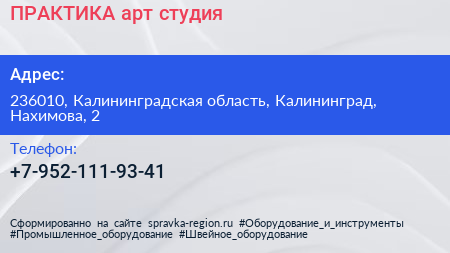 ПРАКТИКА, арт-студия по адресу 236010, Калининградская область, Калининград, Нахимова, 2 в дальнейшем Организация, размещена в следующих категориях: