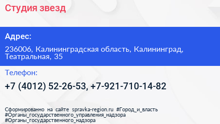 Студия звезд по адресу 236006, Калининградская область, Калининград, Театральная, 35 в дальнейшем Организация, размещена в следующих категориях: